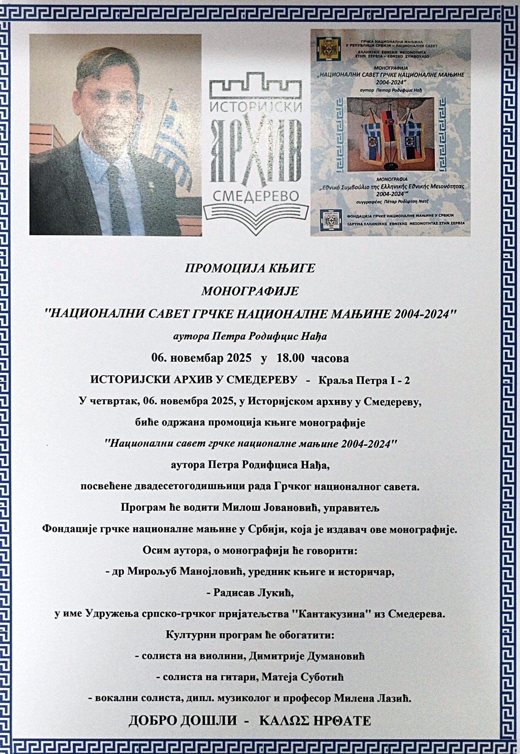 Позивамо вас на промоцију монографије „Национални савет грчке националне мањине 2004-2024“ аутора Петра Родифцис Нађа.
